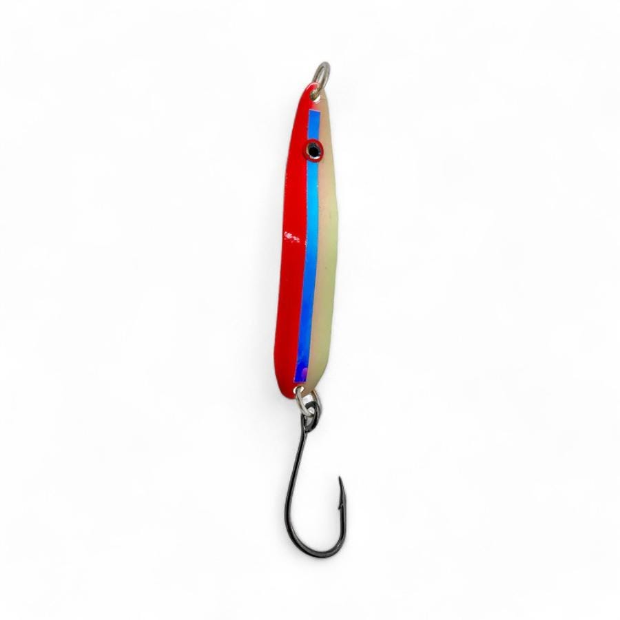 La cuchara Gibbs Skinny G es una herramienta ligera de trolling diseñada para imitar a pequeños peces de cebo. Su acción errática y cambiante simula heridas, atrayendo a los depredadores más cautelosos. Con colores rojo, celeste y blanco, la Skinny G cuenta con un ojo realista, anillos soldados y un gancho Mustad Ultra Point, disponible en acabados Glow o Níquel. Con un peso de 1/4 oz, esta cuchara es efectiva a velocidades de trolling de 2 mph y superiores.