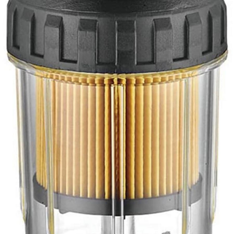 Fabricado en aluminio anodizado COLOR NEGRO, con contenedor transparente que se puede quitar para limpiarlo o reemplazar el filtro. Servido con accesorios.Versión: Filtro de gasoilTornillo de drenaje de agua: síCaudal: 200 l/h (0.49 PSI) - 312 l/H (1.5 PSI) - 411 l/h (2.45 PSI)Altura: 190 mmCartucho Ø mm: 110Incluye conectores de manguera UNC de 11/16 "Cartucho repuesto: RA510A03110 micras