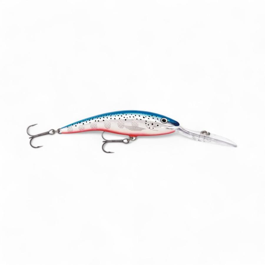 El señuelo Rapala Deep Tail Dancer® en color azul y plateado cuenta con un labio de inmersión ampliado y extremo que permite que el señuelo alcance profundidades de hasta 12 metros sin asistencia. Su cuerpo en forma de banana proporciona una acción de nado con amplios movimientos de cola, característica que solo puede ser lograda con balsa. Este señuelo es ideal tanto para lanzado como para trolling, y es eficaz para capturar diversas especies en todo el mundo.